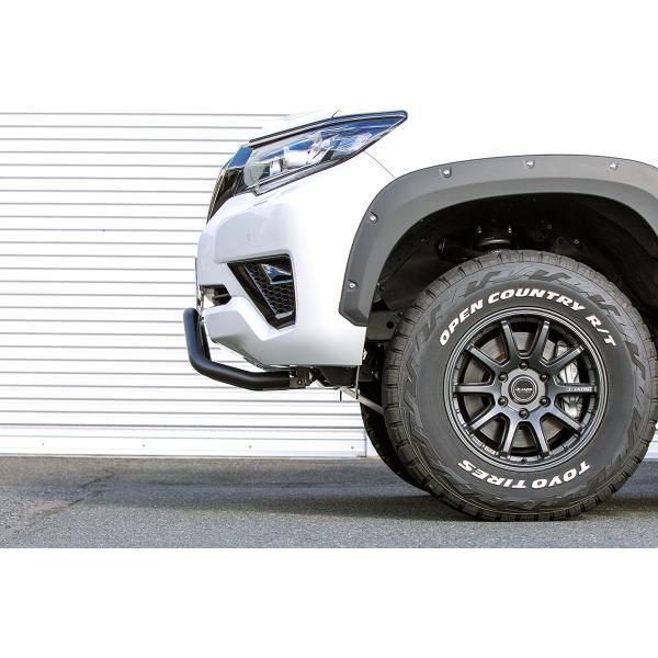 フロントフェイスにワイルドな印象を与える本製品は、高品質なステンレス製の本体にブラック粉体塗装を施し、耐腐食性、耐チッピング性を高めたタフネス仕様です。また、ボリューム感のあるアイテムですが、取り付けはボルトオンで簡単に装着することができます。